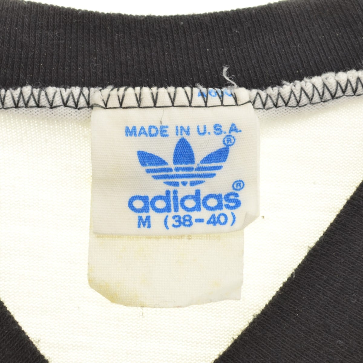 商品名:ADIDAS / アディダス〜80s USA製 トレフォイルVネック半袖Tシャツ 商品コード:G006260146 表記サイズ:M 実寸:肩幅約39cm 総丈約70cm 身幅約45.5cm 袖丈約23.5cm カラー:ホワイト系/ブラック系 コンディション:USED品となりますので、使用感があり、全体的に毛羽立ち、フロントや袖に薄汚れが見られますが、その他ダメージや汚れはございません。 素材:ポリエステル50%、コットン50% 付属品:-